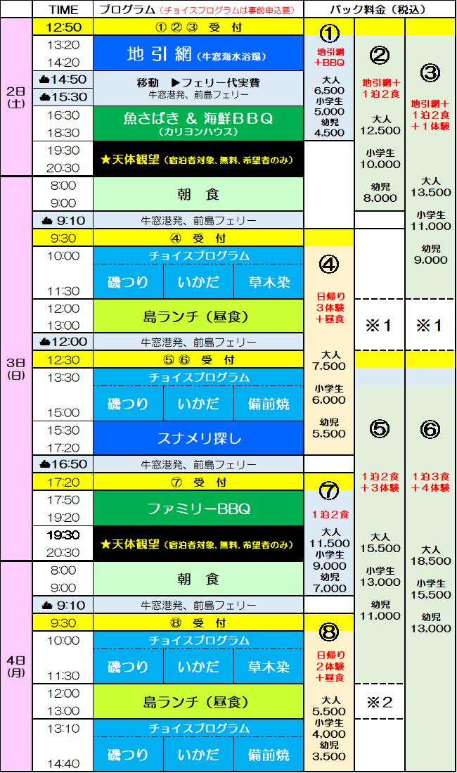 | ① | 5月2日 地引網+BBQ・日帰りプラン | 6,500円 | 5,000円 | 4,500円 |