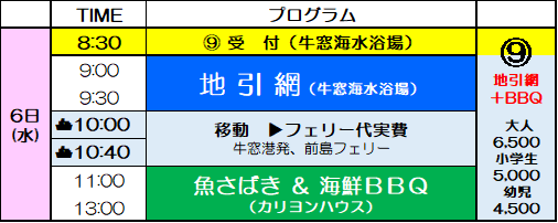 | ⑨ | 5月6日 地引網+BBQ 日帰りプラン | 6,500円 | 5,000円 | 4,500円 |