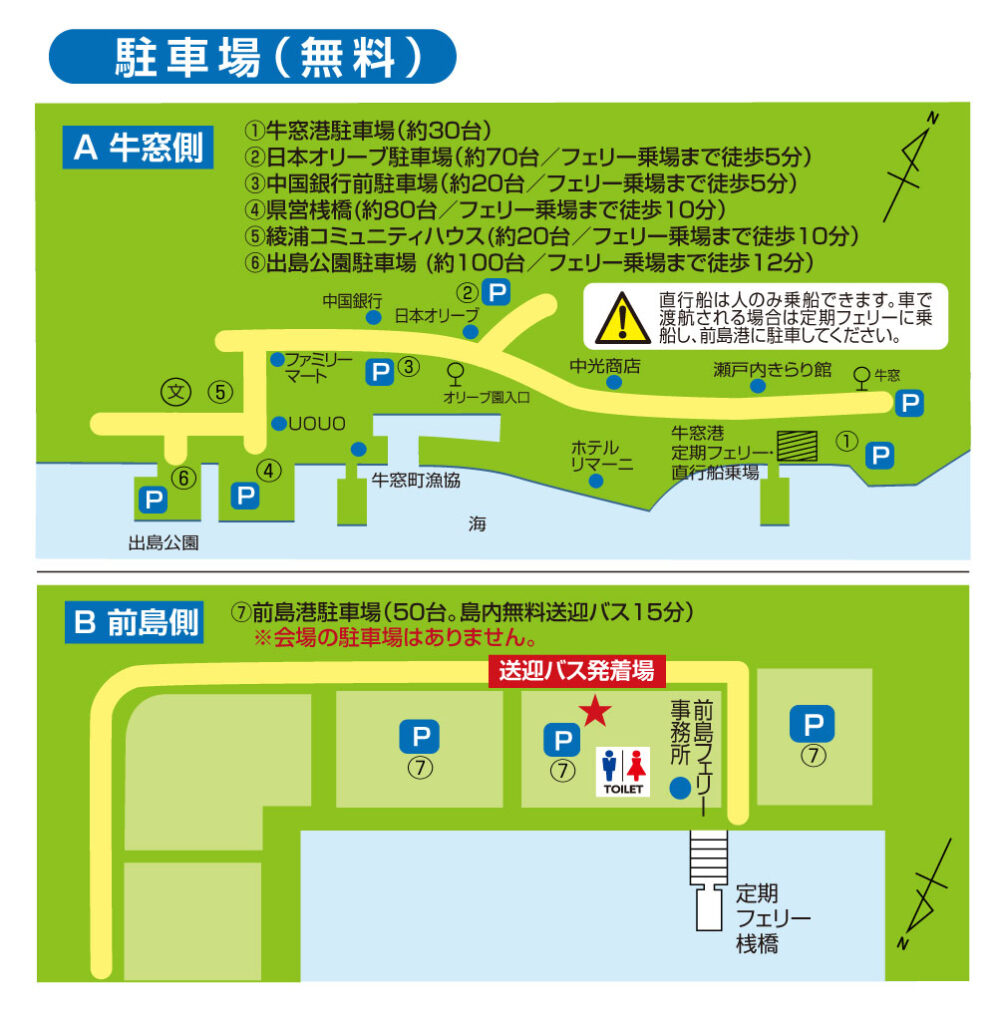 牛窓(本土)側の駐車場(①~⑥)をご利用ください。 |